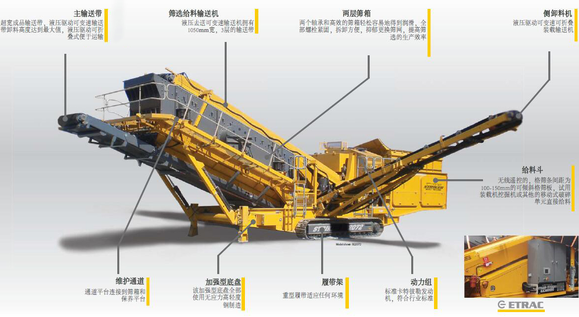 斯泰克履带式筛分机使用高效率倾斜和水平振动筛箱,提供卓越的输出能力和准确的筛选,在采矿程序,砂,砾石,骨料或回收/拆卸材料的工程里提供搞笑的生产能力和精确的筛选分离坚固的履带和底盘确保良好的现场定位和机动性以及良好的操作稳定性。可变速的主输送机可选用液压或电动(可选)操作,同时便于运输。