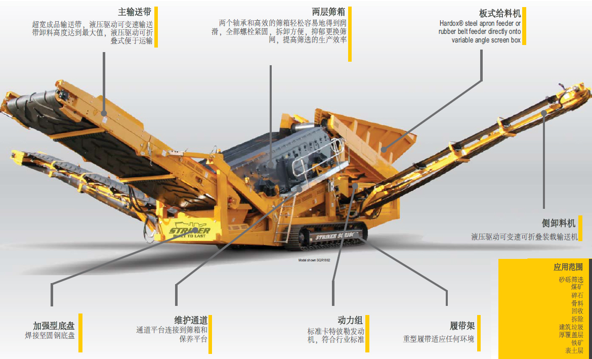 斯泰克履带式筛分机使用高效率倾斜和水平振动筛箱,提供卓越的输出能力和准确的筛选,在采矿程序,砂,砾石,骨料或回收/拆卸材料的工程里提供搞笑的生产能力和精确的筛选分离坚固的履带和底盘确保良好的现场定位和机动性以及良好的操作 稳定性。可变速的主输送机可选用液压或电动(可选)操作,同时便于运输。